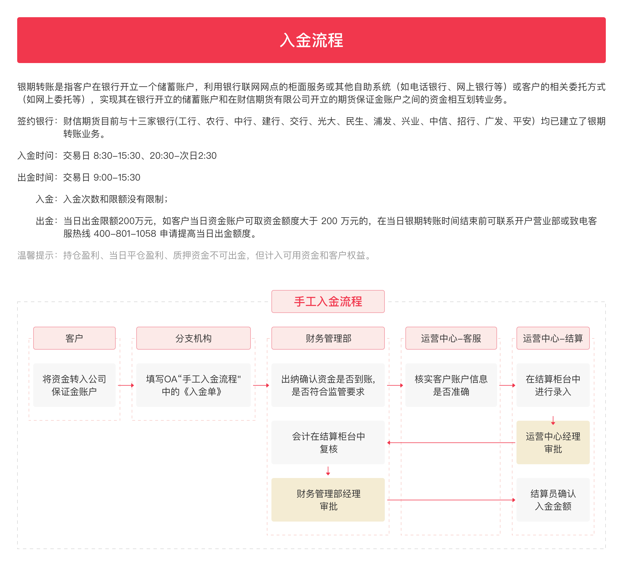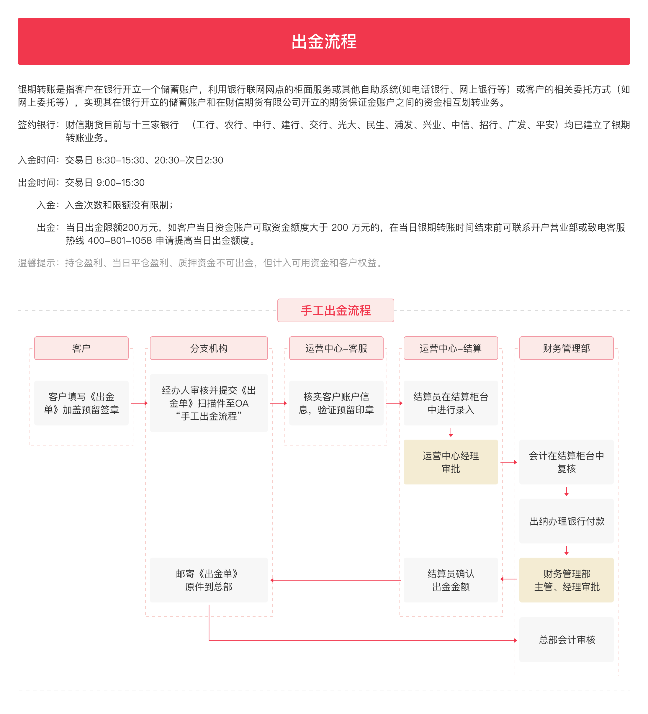2、客户填写提款单提交至期货公司财务部,完成审核后资金转入客户指定银行账户。