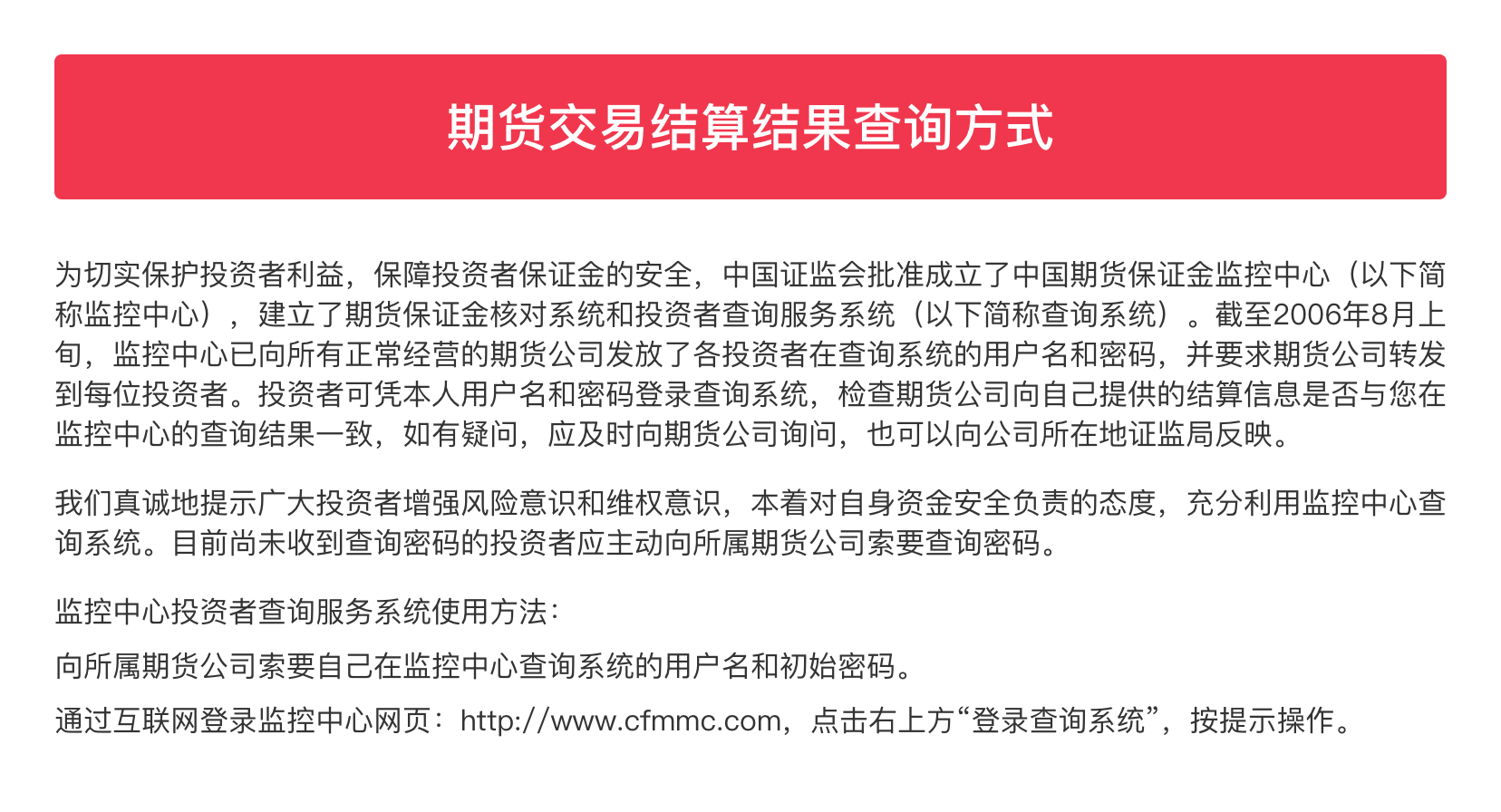 交易结算结果查询方式:http://www.cfmmc.com