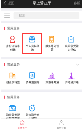 登录手机交易软件“财富乐赚”,选择“我的”—业务办理—个人资料修改-点击“立即办理”,登录后选择“修改”,点击“保存”即可。 下载 “财富乐赚” 的链接地址:/main/include/software.html