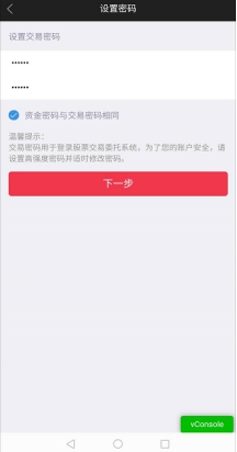 步骤4:设置交易密码和资金密码,两个密码可以设置成一样,也可以设置为不同,并提交审核。